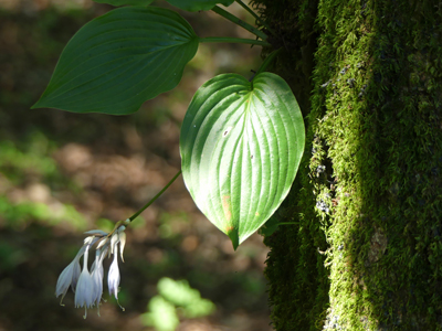 ウナズキギボウシ 名前は花が下向きにうなだれることから、この名前がついたそうです。バスの停留所にこの後に戻りましたが、残った時間でハガクレツリフネを探しました。 |