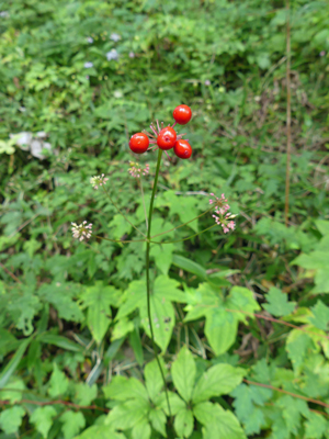 | この木にはカメムシがよく来ていました。上はハサミツノカメムシの仲間の雌、下はモンキツノカメムシだと思います。 | トチバニンジン 赤い実が目立っていました。 |