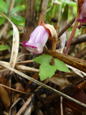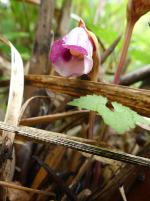 | ナンバンギセル 前回来た時は終わっていましたが、気温が下がり雨が多くなったせいか1つだけ咲いていました。右の写真は左と同じ個体の花の中を写したものです。 |