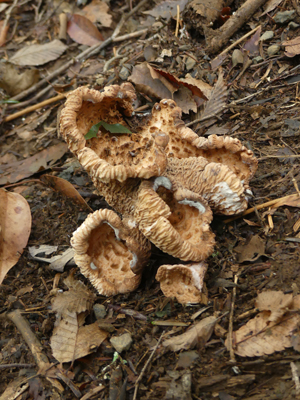| 葉の形からたぶんフユノハナワラビだと思いますが、合っているでしょうか。 | ノウタケだと思います。暗い樹林帯だったのでデジカメを地面に置いて撮りました。 | |