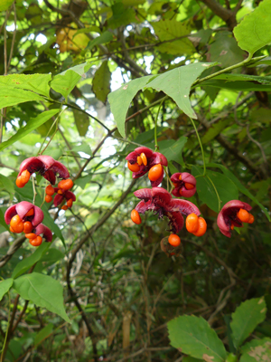 | ツリバナの仲間の実が成っていました。種類まではよくわからないです。 | ゴンズイ 目の前の高さで実が成っていました。まだ弾けていないものも結構ありました。 |