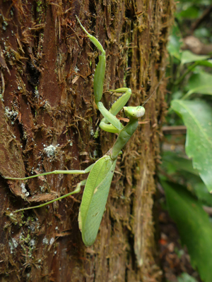 | ハラビロカマキリ なぜか餌が居なさそうな木の幹にとまっていました。産卵場所を探していたのでしょうか。 |