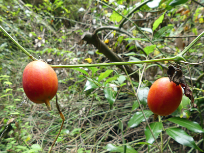 ![]() カラスウリ 今年初めて赤く熟しているのを見ました。実が丸っこくて小ぶりなように思いました。 |