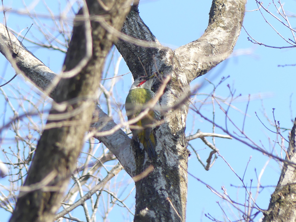 | アオゲラ 休日閉園している自然観察園の樹木の間を飛び交っていました。(2025/12/30撮影) |