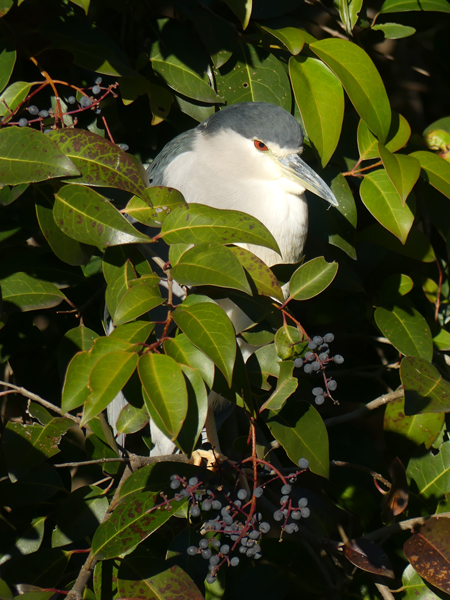 | ゴイサギ ここから井の頭公園の写真です。カモ類を見に来たのですがカルガモ、マガモ、キンクロハジロくらいしか居ませんでした。池のふちを回っていたらばゴイサギが茂みから顔を出していました。(2026/1/3撮影) |