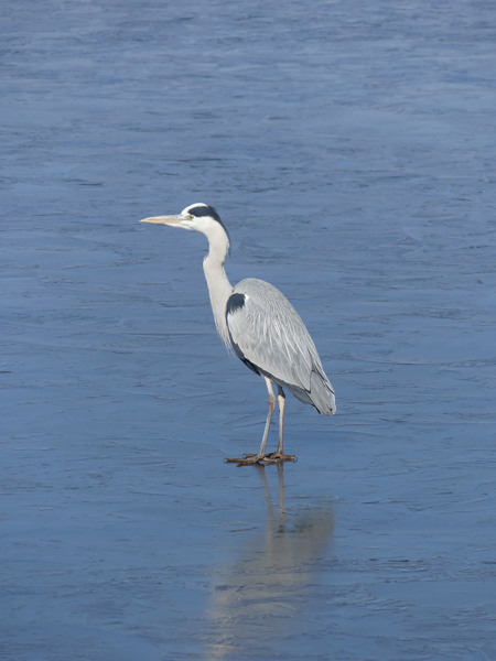 | アオサギ 水面が凍っているので足の様子がよく見えます。このアオサギは別の場所から移動してきたのですが、降りた時に少しすべっていました。 |
