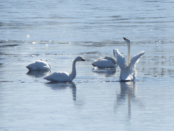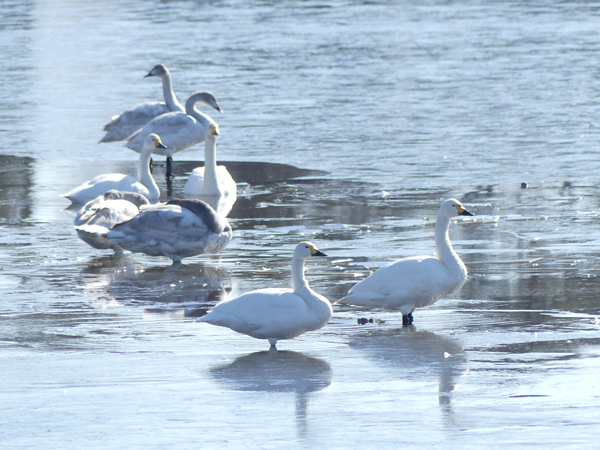 | コハクチョウ 手前の水面が凍っていますが、ここに来て初めて凍っているところを見ました。。 |