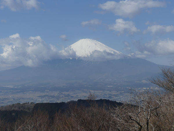 | 矢倉岳山頂から見た富士山です。かなり雲がかかっていましたが、一瞬、山頂が綺麗に顔を出しました。 | ||