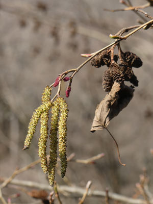 | ハンノキの仲間だと思います。雄花と赤い雌花がよく見えていますし、昨年の実もまだ残っていました。 | ||