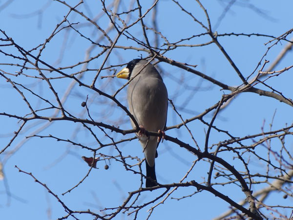 | イカル 早朝、群が川沿いの木に来ていました。割と近くで見ることができました。 |