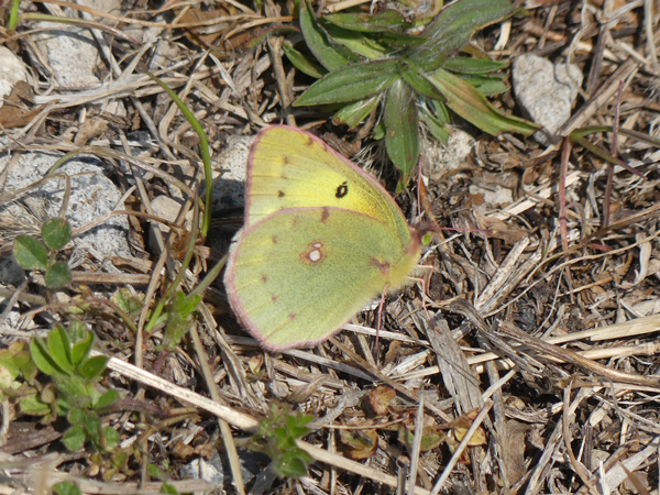 | モンキチョウ 日に当たろうと、少し斜めに翅を傾けてとまっていました。 |