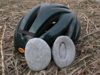 | これは、「Ear Bag」と言います。耳にかぶせる防寒カバーです。中に反ったプラスチックが入っていて、それを曲げてから耳にはめ込んでから元に戻して固定させるような作りです。 見て、衝動買いしました。早速使ってみたのですが、残念ながら?小春日和という天気で、あまり効果を実感できませんでしたが、ヘルメットを被っての装着は、邪魔にはなりませんでした。今週末は寒そうだから、威力発揮かもしれません。(2003/01/16 記) |