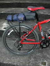 | 今度はリヤキャリヤを付けました。荷物が多くなる場合を考えるとあった方が良いかな、と思ったからです。今日は輪行袋をくくりつけました。これで万が一の場合にも自転車を畳める、と思ったのですが、途中で雨に降られたので、結局、輪行袋はリュックにしまいました。(2003/03/16 記) | ![]() |