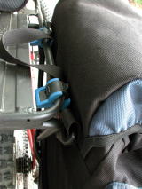 | リヤバッグのアタッチメントの拡大写真です。リヤキャリヤにしっかりと付くように、はめ込んでから水色の部分を回転させて固定することにより、衝撃で外れないような作りになっています。(2003/04/30 記) | ![]() |