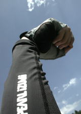 | 腕のカバーはパールイズミ製の「メッシュ UVアームカバー」という商品て日焼け止めです。以前、手がヒリヒリした事があったので試してみました。そこそこ快適です。指出しの手袋はSpecialized製ですが、さすが、BodyGeometryと主張するだけの事はあって使いやすいです。(2004/08/20 記) | ![]() |