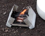 Esbitにやかんをのせた所と、火をつけて燃やした様子です。小さな燃料ですが、意外とよく燃えます。